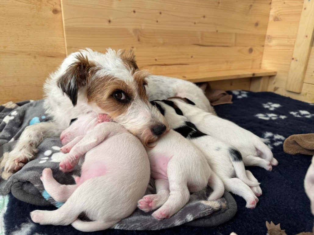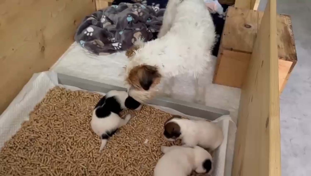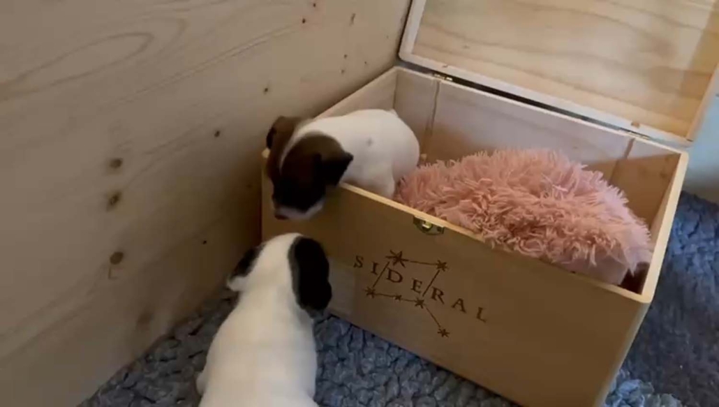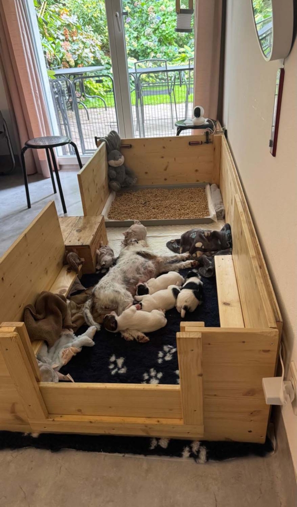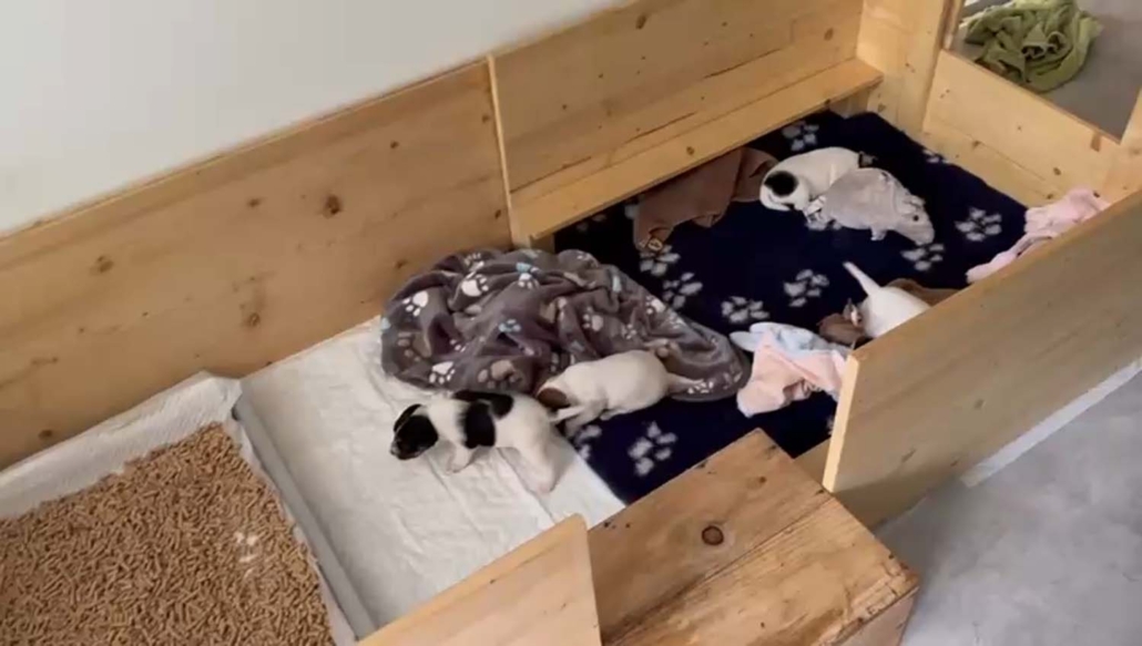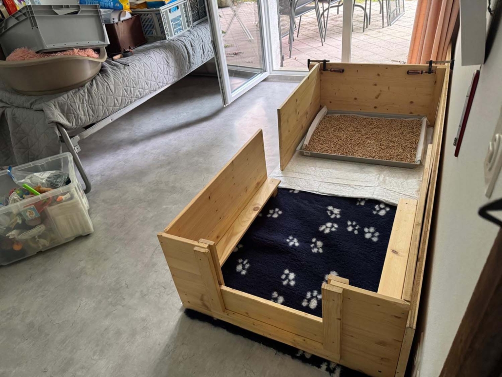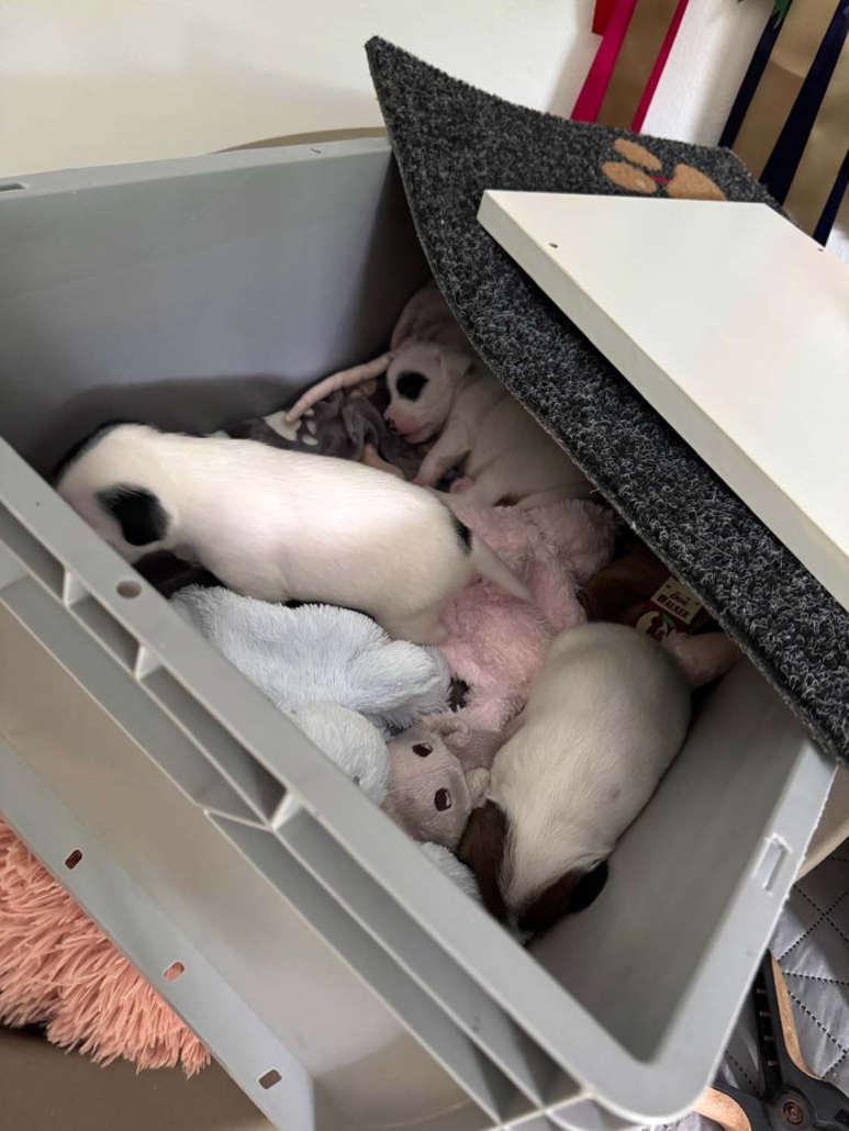 Damit sie genügend Platz zum Entdecken, Spielen und Kuscheln haben, sind sie mit Mama Gucci nun in eine grössere Welpenkiste umgezogen – quasi in ihre erste richtige „Wohnung“.