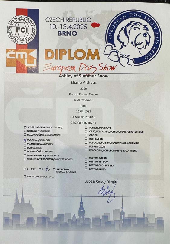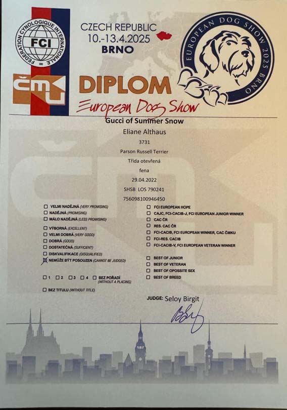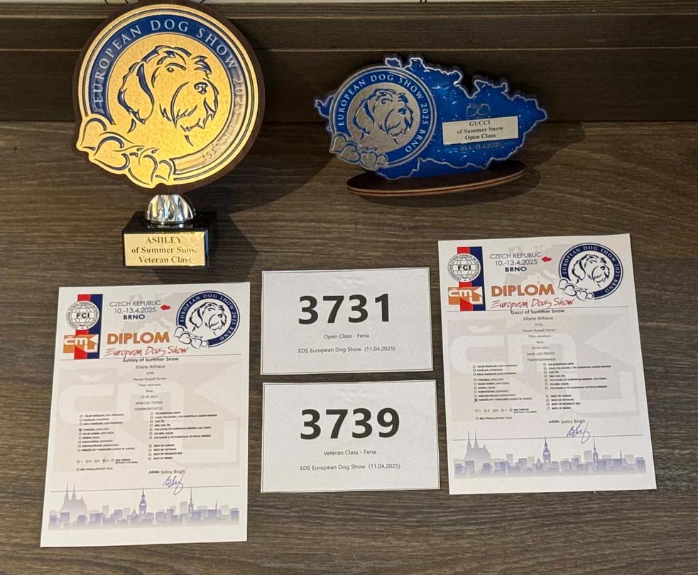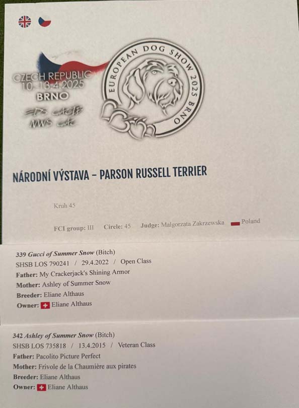 Ein aufregendes Wochenende liegt hinter uns: Gucci und Ashley nahmen an der National- und Eurodogshow in Brno teil – mit tollen Resultaten und viel positiver Energie in den Hallen. Beide präsentierten sich souverän im Ring und zeigten einmal mehr ihren typischen Parson-Charme.